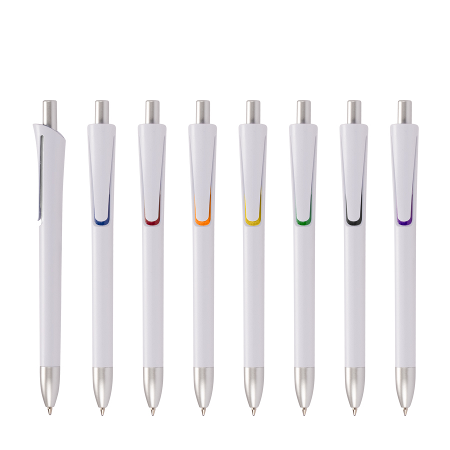 Bolígrafo plástico con cuerpo blanco mate, terminales plateados y detalle bajo el clip de color. Escritura azul.