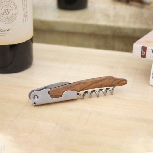 11,6 cm. Acero inoxidable. Peso: 68g.  Abridor de botellas de vino en acero inoxidable con mango de madera en color natural. Accesorios incorporados: sacacorchos, navaja y destapador. Presentación en caja de regalo.