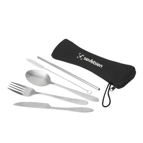 Elementales siempre a manoSet de cubiertos. 5 elementos: Cuchara, tenedor y cuchillo en acero 430; Bombilla y cepillo para bombilla en acero 304. Estuche de eva con cierre y correa de poliéster, color negro. Medida estuche: 7 x 21,5 cm.