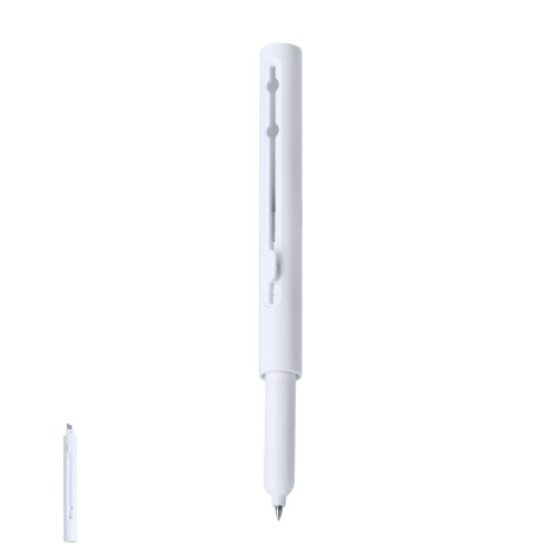 Bolígrafo cúter con cuerpo en ABS en acabado mate. Con pulsador que permite que por un extremo salga el cuerpo del bolígrafo en tinta azul y en el otro extremo punta de metal del cúter se puede retraer cuando no está en uso para mayor seguridad. Ideal para cortar con precisión.