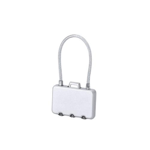 Candado con contraseña numérica metálico de 3 dígitos, botón de apertura en la parte superior y cierre de cable de acero.